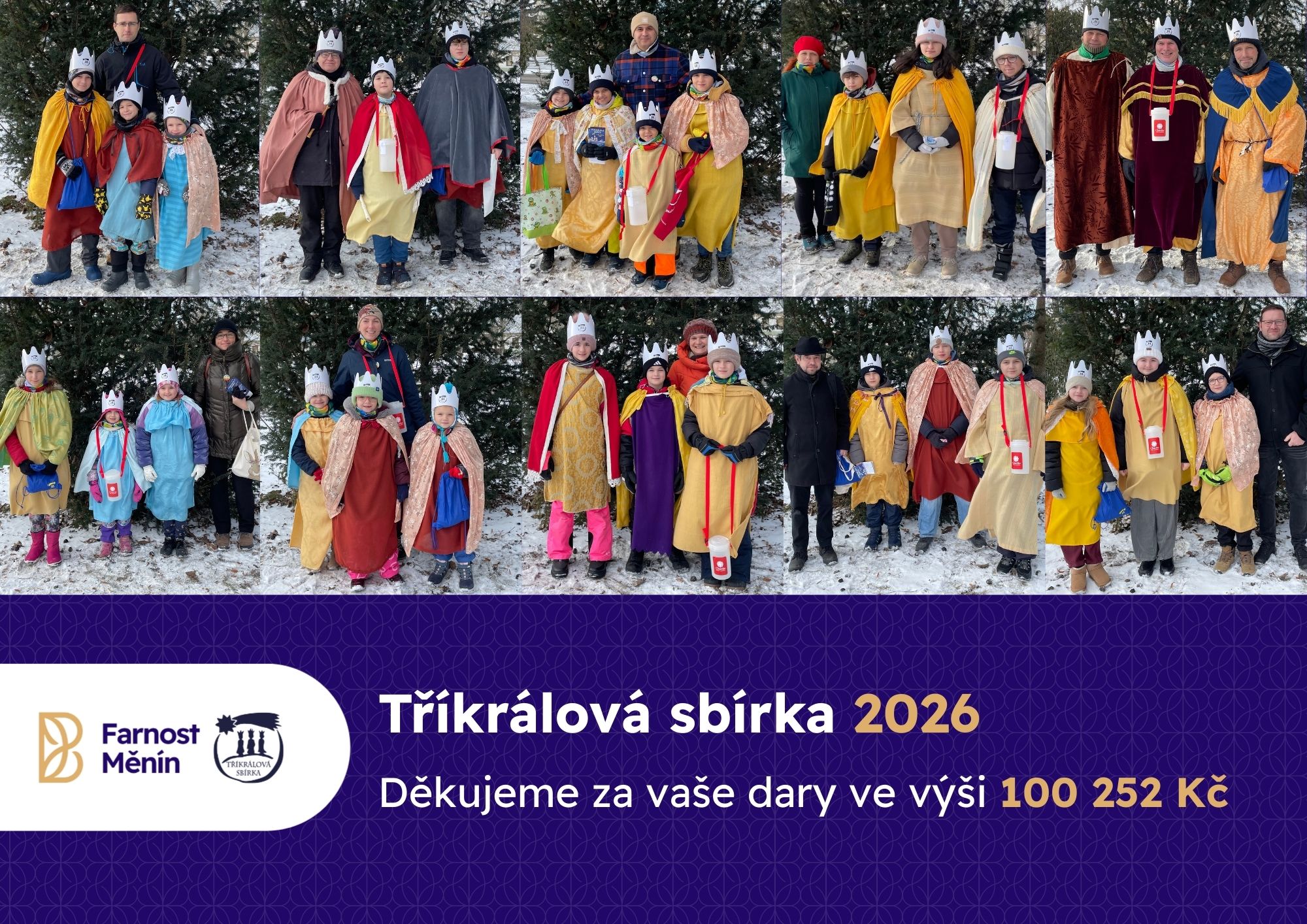 Tříkrálová sbírka v Měníně proběhla v neděli 7. 1. 2024 od 10:00. Podařilo se vybrat celkem 95 857 Kč.